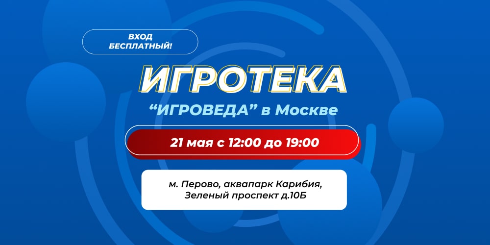 17:30 Розыгрыш подарковБудем рады видеть вас на нашей Игротеке 21 мая, которая пройдёт по адресу: Москва, cтанция метро Перово, , аквапарк Карибия, 3-й этаж.